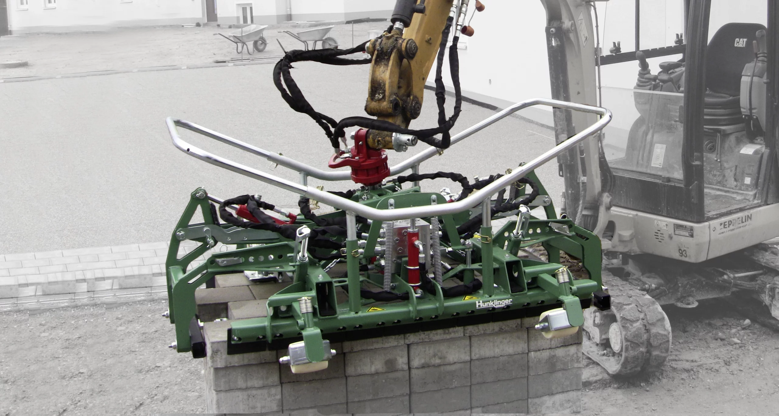 Mit der Pflasterverlegezange von Hunklinger können Steine verschoben, gegriffen und in jeder Situation sauber verleget werden. Die Zange ist für Minibagger ab 1,7 t mit der Aufnahme MS03 geeignet und kann auch mit kleinen Ladern oder Pflastermaschinen genutzt werden.